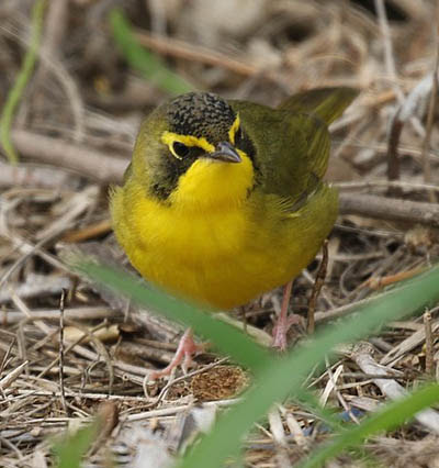 These birds with the yellow eyebrow and underparts are usually found low to the ground.